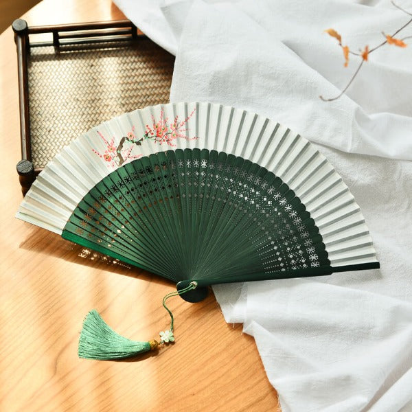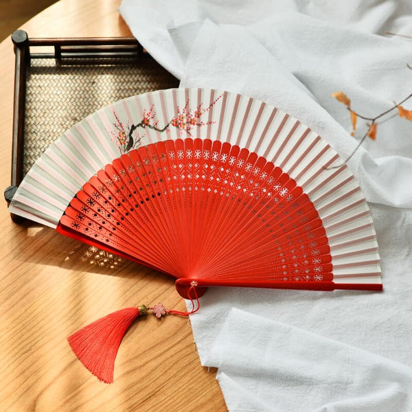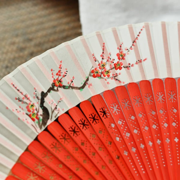 Product Description: Add a unique statement piece to your fans collection with our latest Hand Folding Fan. Crafted from a quality wood and finished off with an exquisite ancient style hand-painted plum blossom pattern that gives the fan a charming look. Its hollow carved design ensures durability and stands the test of time. With its lightweight yet sturdy construction, you can stay cool in summer wherever you go.